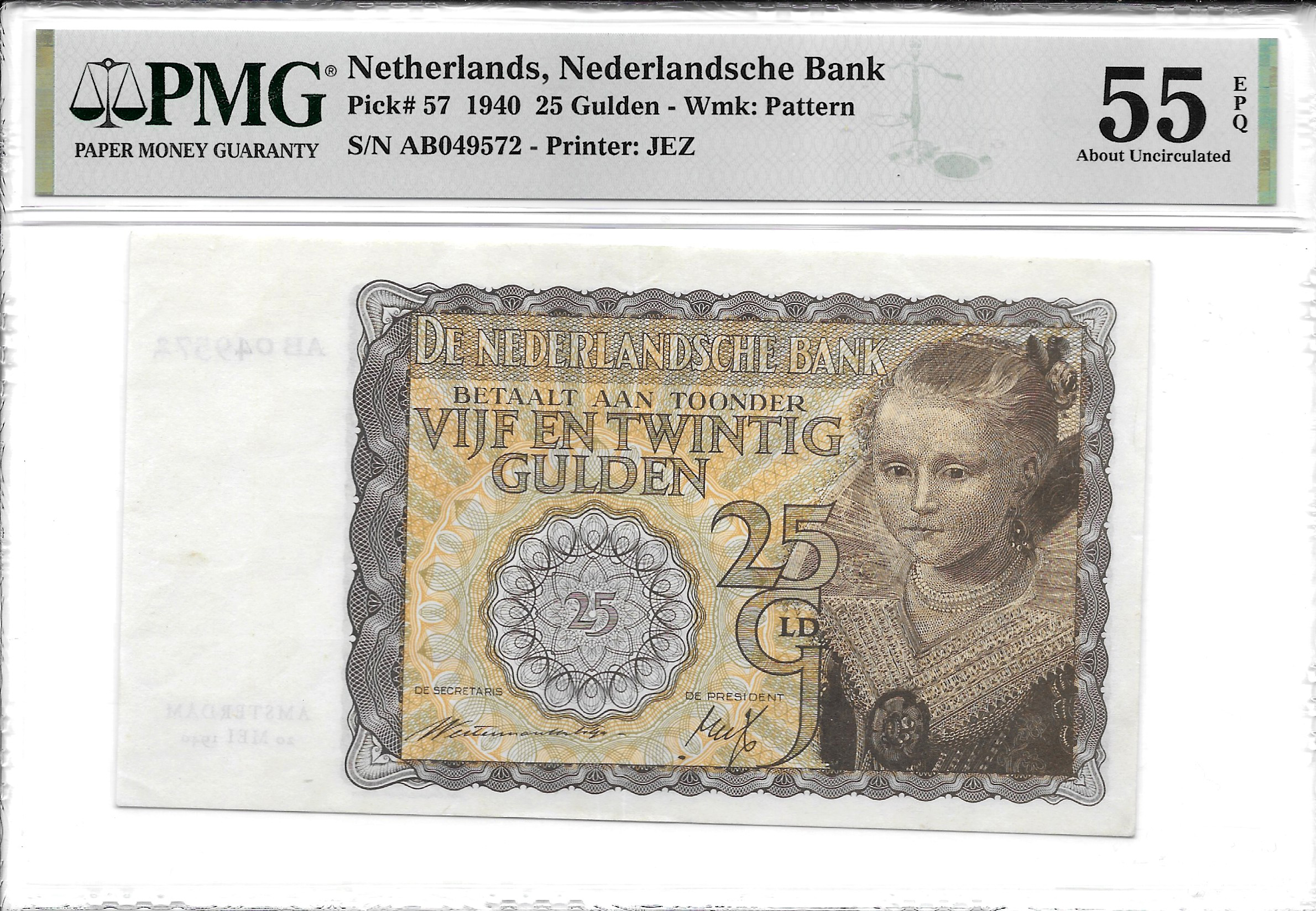 Hieronder staat het PMG populatie rapport van het biljet 25 gulden 1940 Prinsesje, pick# 57.