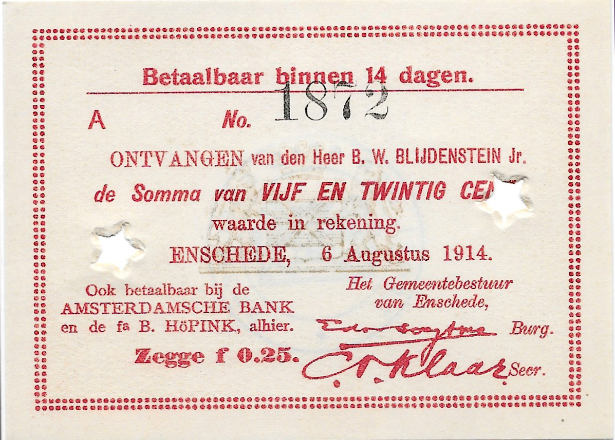 0,25 gulden 1914 Noodgeld Enschede (S/N A1872)