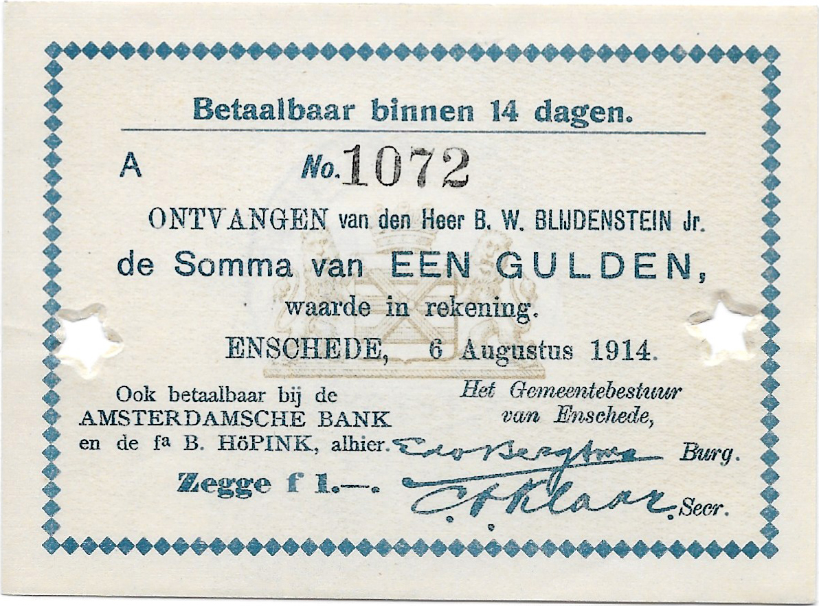 1 gulden 1914 Noodgeld Enschede (S/N A1072)