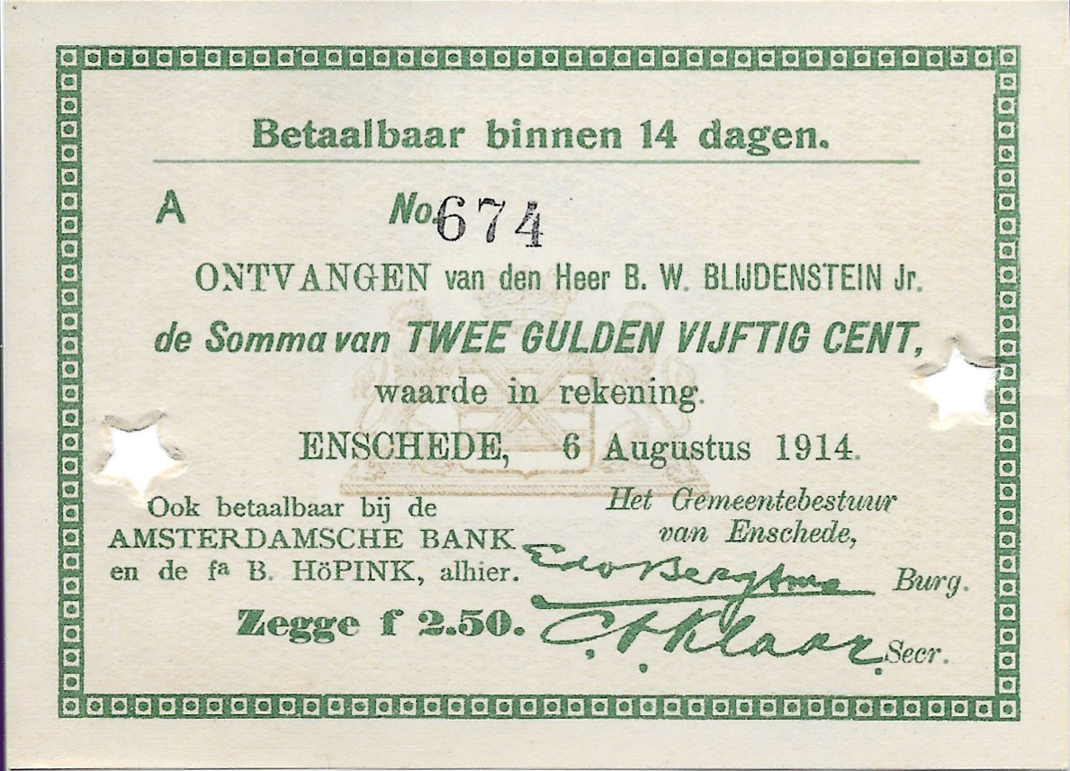 2,5 gulden 1914 Noodgeld Enschede (S/N A674)